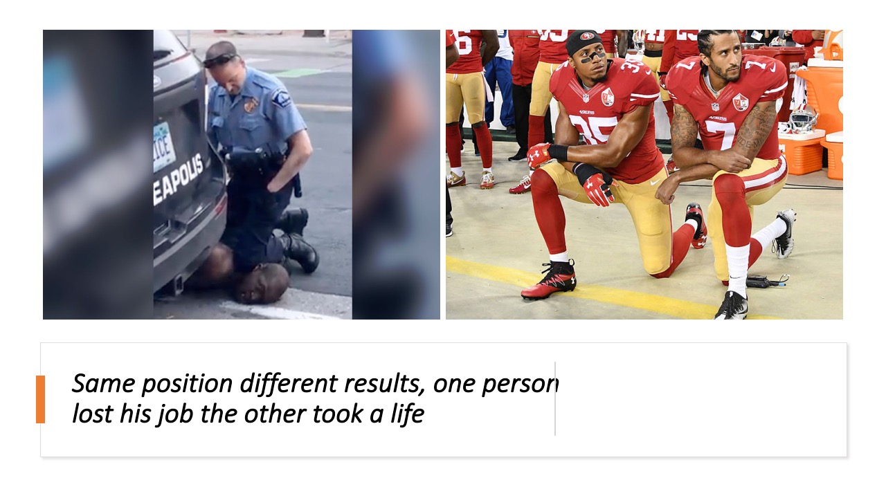 If you are more offended by the knee of Colin Kaepernick during the National Anthem and you are not outraged by the same knee that choked a black man to his death then you, my privileged friend are part of the problem!